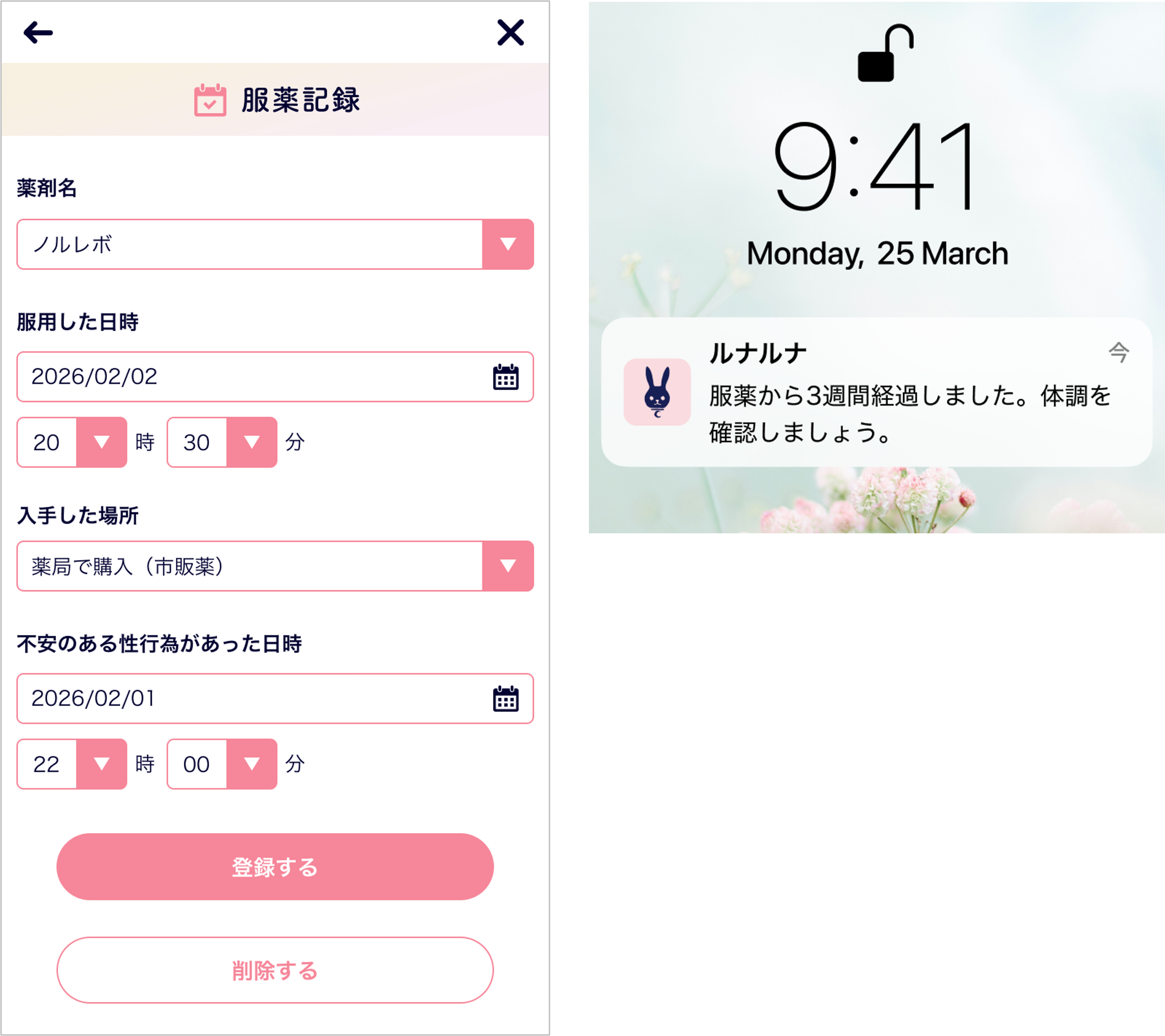 ※1 緊急避妊薬の服薬記録や、服薬後の体調確認のタイミングをお知らせする機能は、『ルナルナ』アプリバージョン12.2.0以上に対応しています
